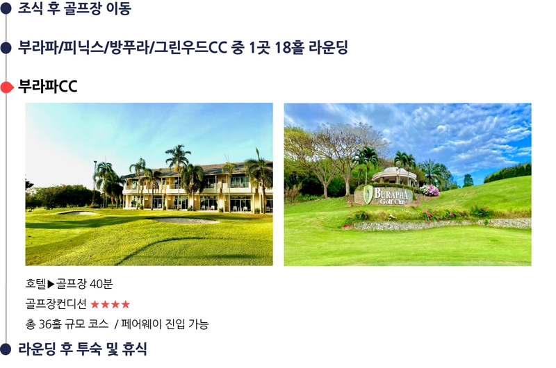 ■ 왕복항공료 +유류,TAX ■ 파타야시내 호텔 (2인1실) ■ 전일정 호텔조식/클럽중식 ■ 그린피(1일/18홀) ■ 호텔과 골프장 픽업서비스 (골프장 및 시내 식사이동) ■ 전동카트[1인1카트/18홀/700바트~] ■ 1억원 여행자보험 |