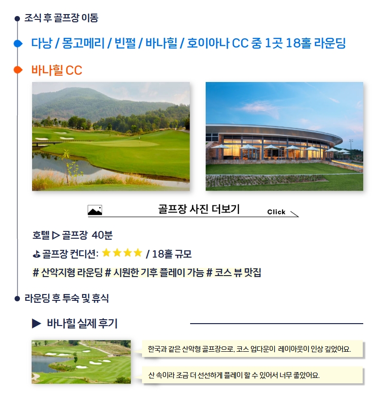 ● 왕복 항공권 및 TAX ● 전 일정 호텔 (2인1실) ● 전 일정 조식 ● 전 일정 그린피 ● 전동카트 (2인1카트) + 캐디피 ● 일정간 단독 차량 및 기사 ● 해외 여행자 보험 가입 (1억원) ● 한국어 가능한 현지 매니저 응대 ※ 베트남의 골프장은 4인 1개조 원칙으로, 현지 상황에 따라서 라운딩이 조인 되실 수 있으며 1부 티업은 멤버에게 우선권이 있습니다. ★ 계약 전 티업 사전 안내 서비스 - 골프투어로는 불확실한 티업 없이, 사전 티업 안내 후 계약을 진행합니다. |
