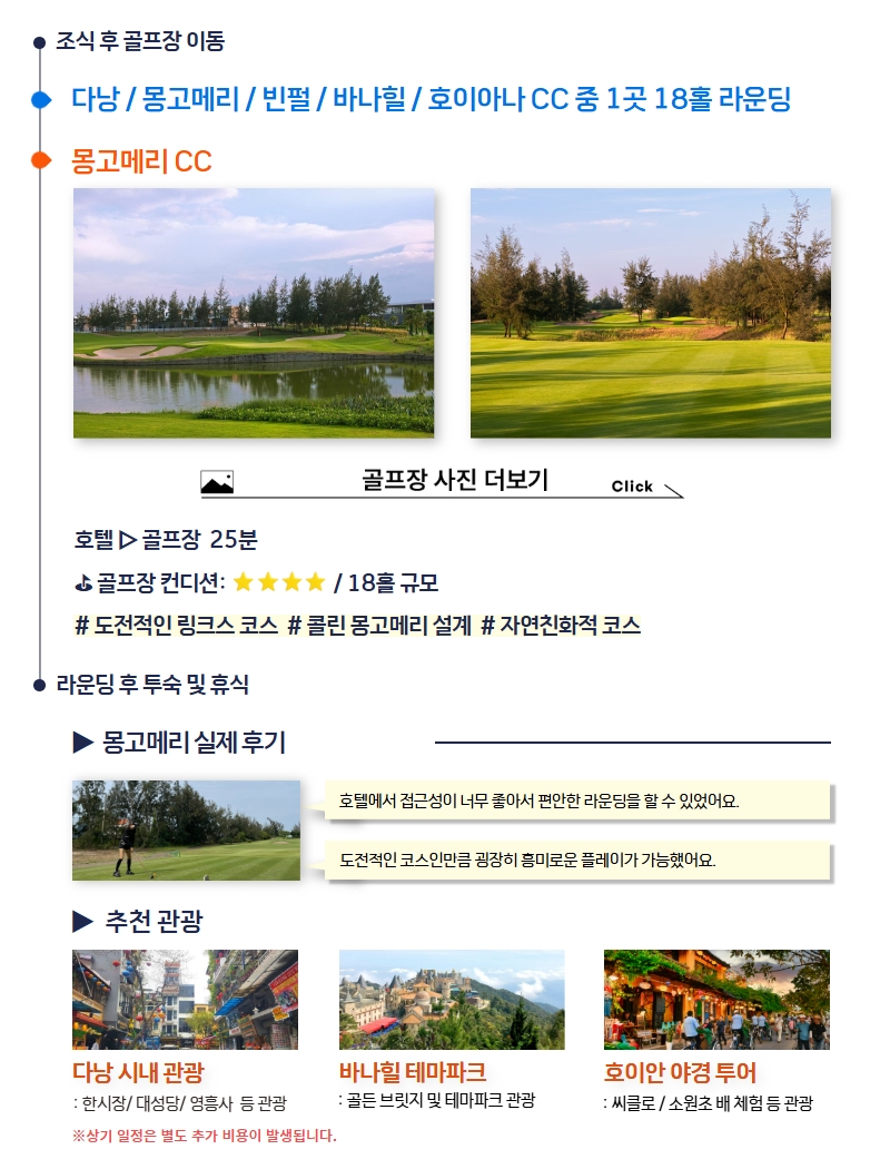○ 클럽 중식($15~) / 석식 ○ 캐디팁 (1인/18홀/$20 또는 VND 500,000) ○ 미팅/샌딩비용 (4인기준/1인/$50 또는 VND 1,300,000) -> 4인 미만 시, 총 $200 맞춰서 내주시면 됩니다. -> 해당 상품은 가이드 없이 진행되는 자유여행 골프입니다. ★1일차 공항 미팅 및 호텔 체크인은 현지 직원이 안내해드립니다. |